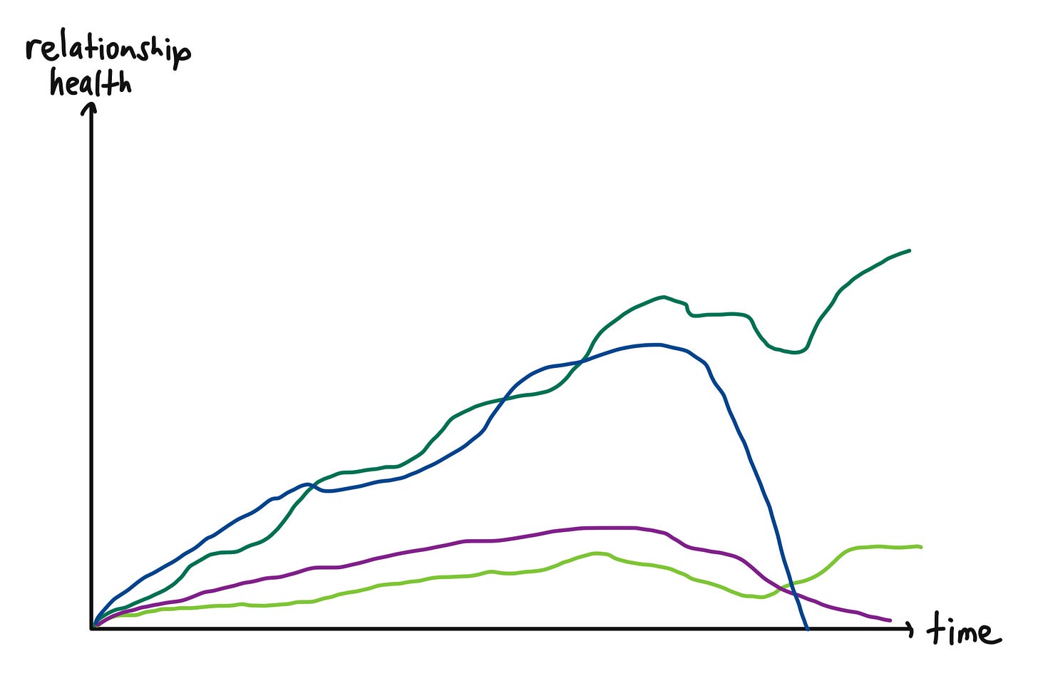In the above graph, the dark green line could represent a healthy relationship (with ups and downs, of course) nurtured over a long period of time. The dark blue could represent you cheating on your partner (thereby plummeting the relationship health), the purple a high school friend with whom you fell off with in college, and the light green a slowly building roommate bond.